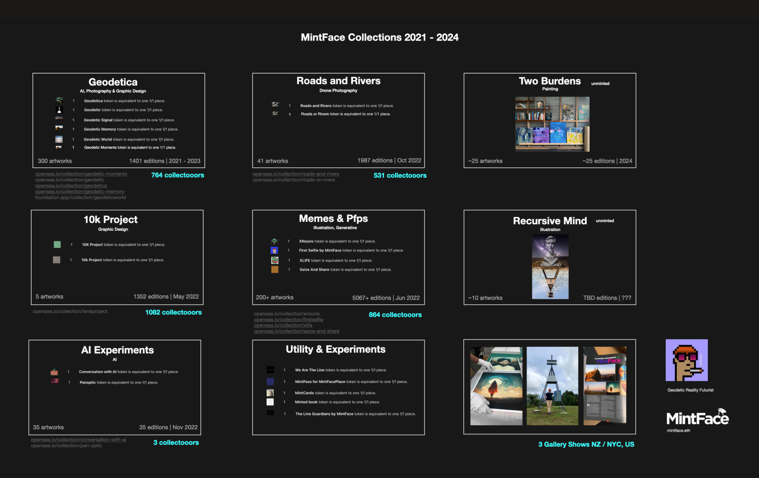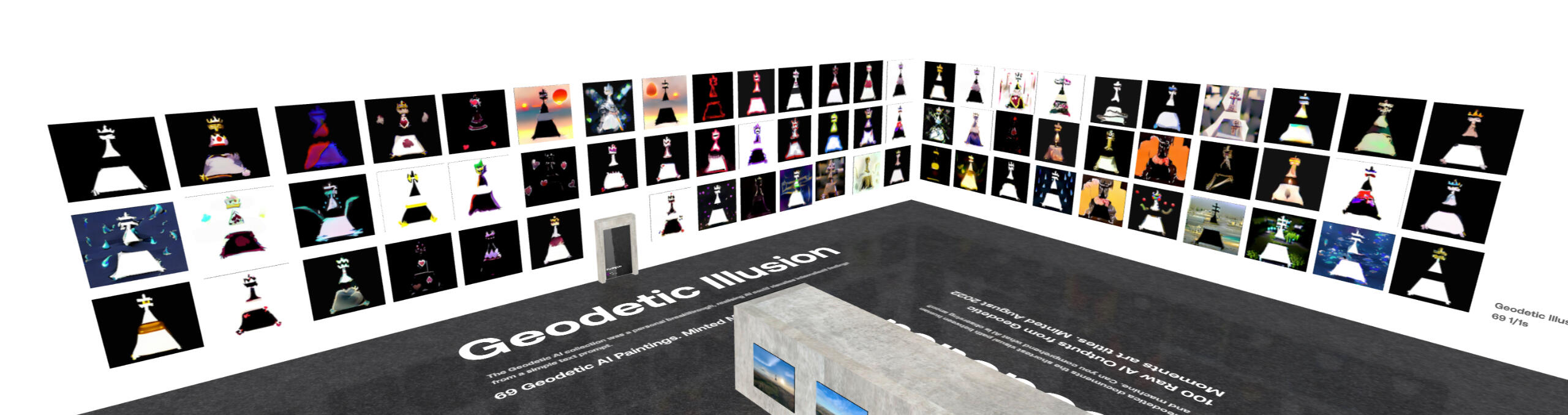 Geodetica mirrors the Geodetic Moment collection by repurposing photo titles into AI prompts.Exhibited at NFT Aotearoa 2022.
