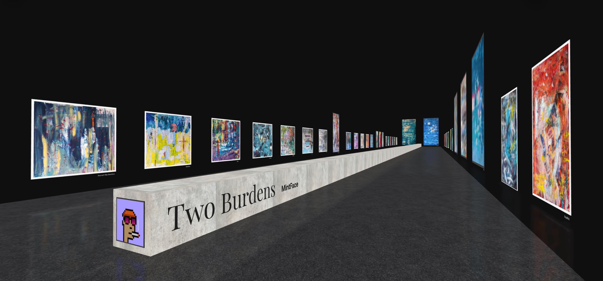 "Painting at the dawn of digital art and AI may seem counter-culture, and that's the point. The tension of techno-optimism and financial nihilism both simmer in Two Burdens." MintFace